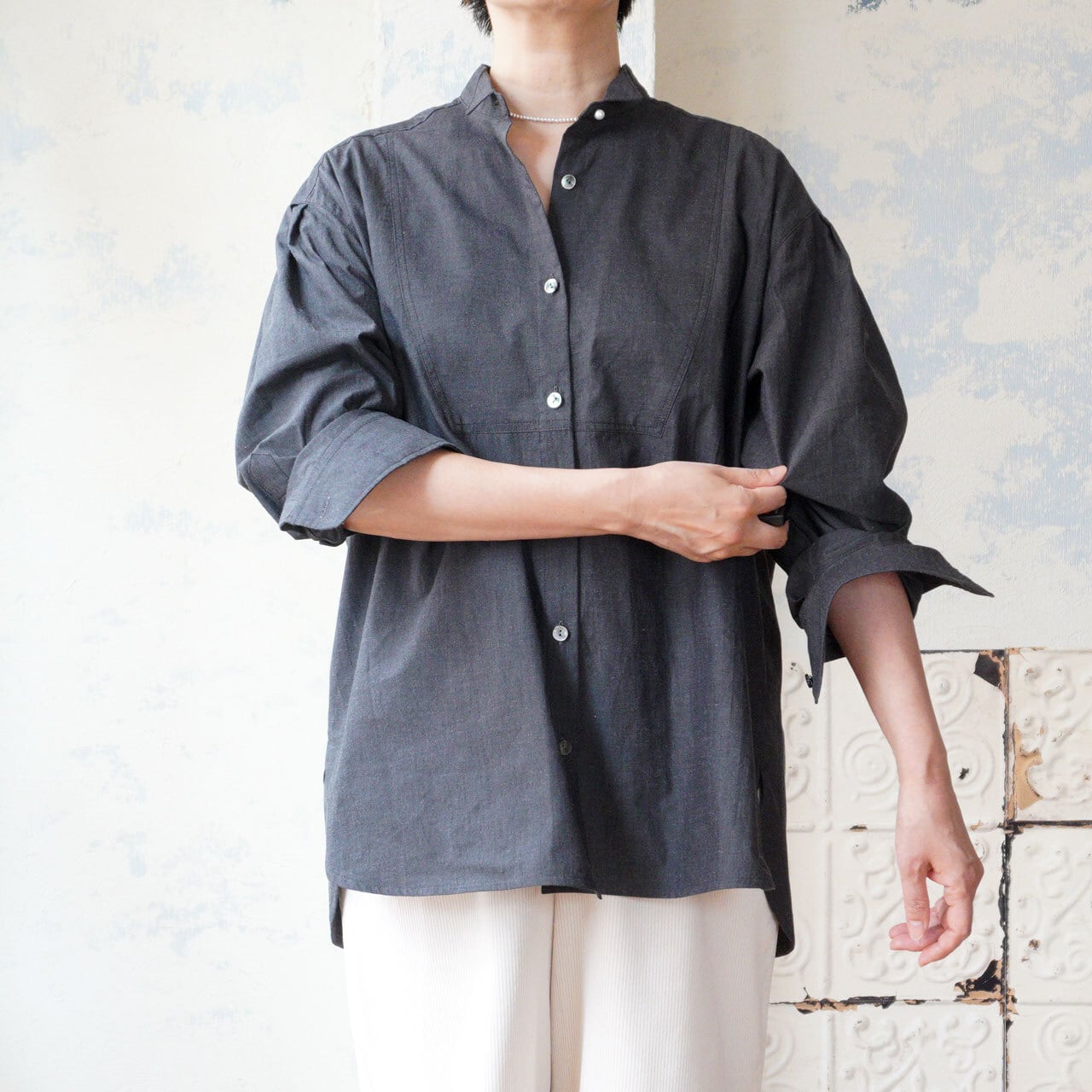 綿麻シャンブレー・バンドカラーシャツ *リヨカ(Liyoca)