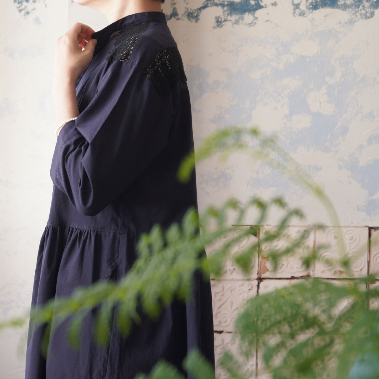 スーペリアオーガニックコットンローン・ノスタルジックレース バンドカラーワンピース *プラネード
